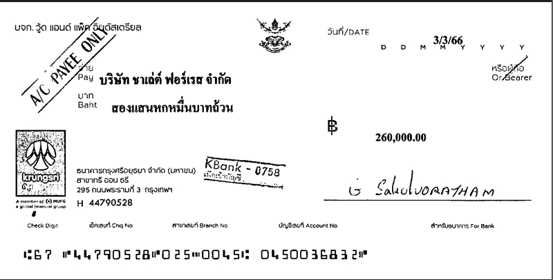 รับฝากเช็ค บริษัท วู้ด แอนด์ แพ็ค อินดัสเตรียล จำกัด สำนักงานใหญ่ ตัดชำระ INVPD2301-0047