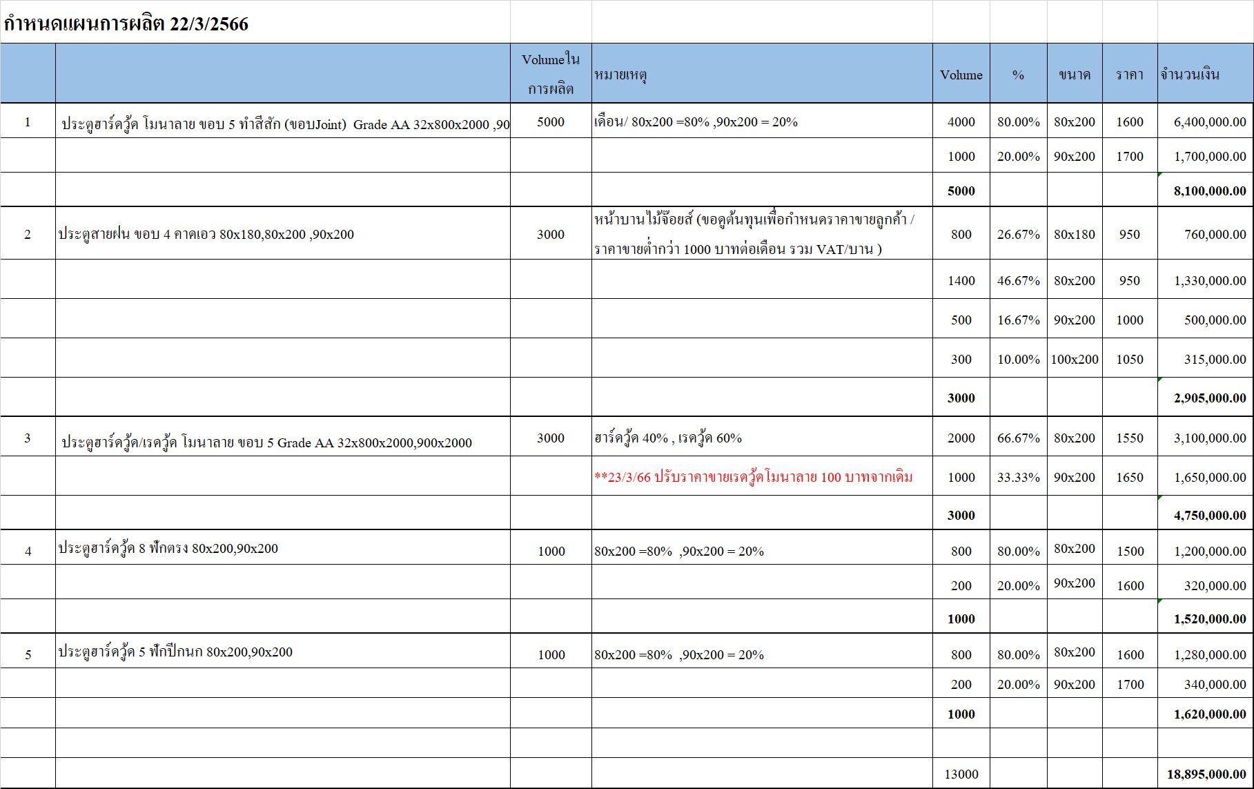 สรุปเรื่องการกำหนดแผนผลิต ประตู หน้าต่าง 22/3/2566