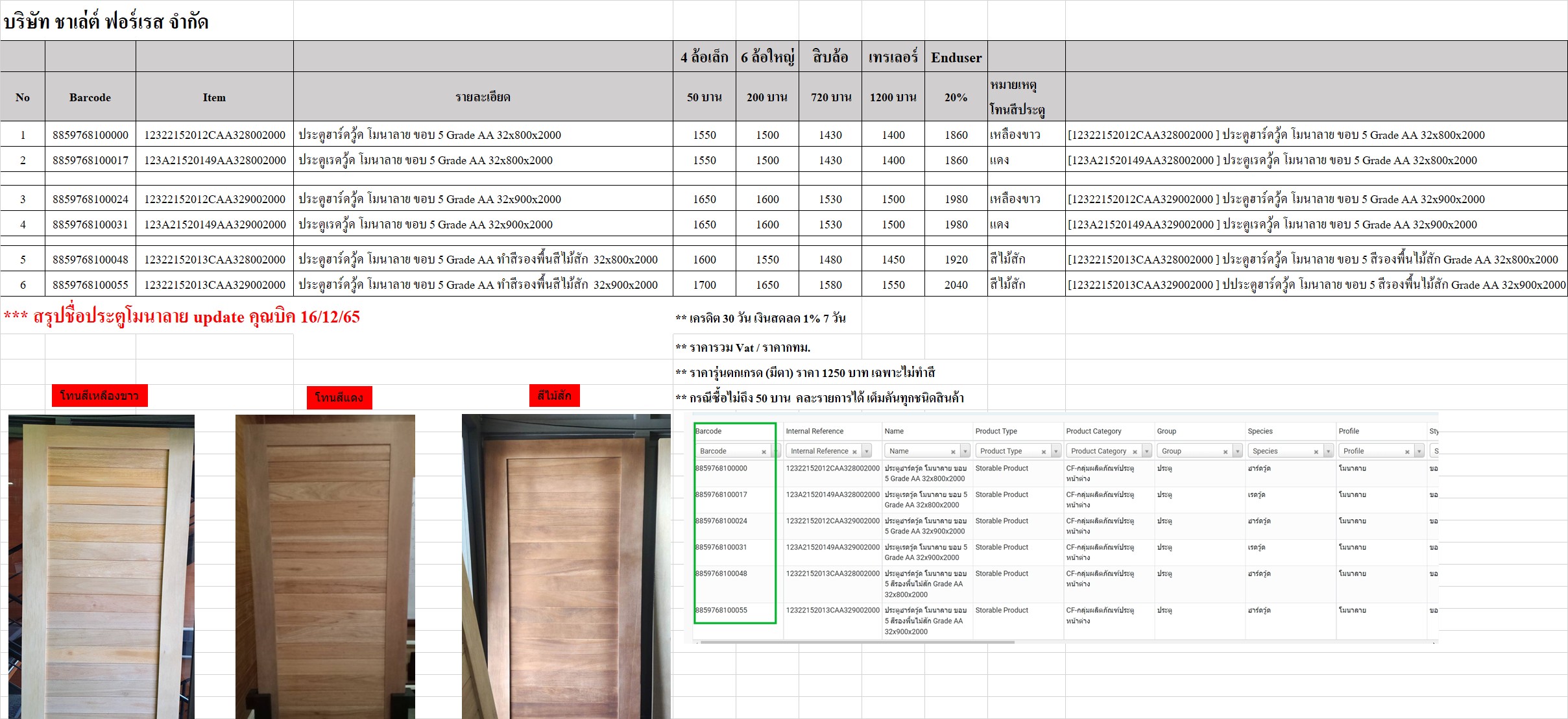 item ประตูฮาร์ดวู้ด /เรดวู้ด โมนาลาย ขอบ 5 เกรด AA (ตัวใหม่) คะ สามารถหาสินค้าจาก บาร์โค๊ด 885 ได้คะ / ทั้งนี้ได้บวกเพิ่ม 20% เป็นราคา Enduser ให้แล้วคะ