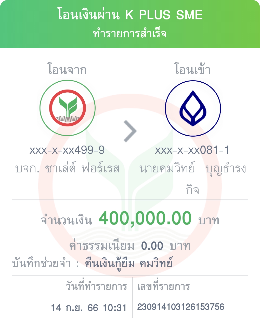 ผมโอนให้กู้ยืม ไป 400000 บาท