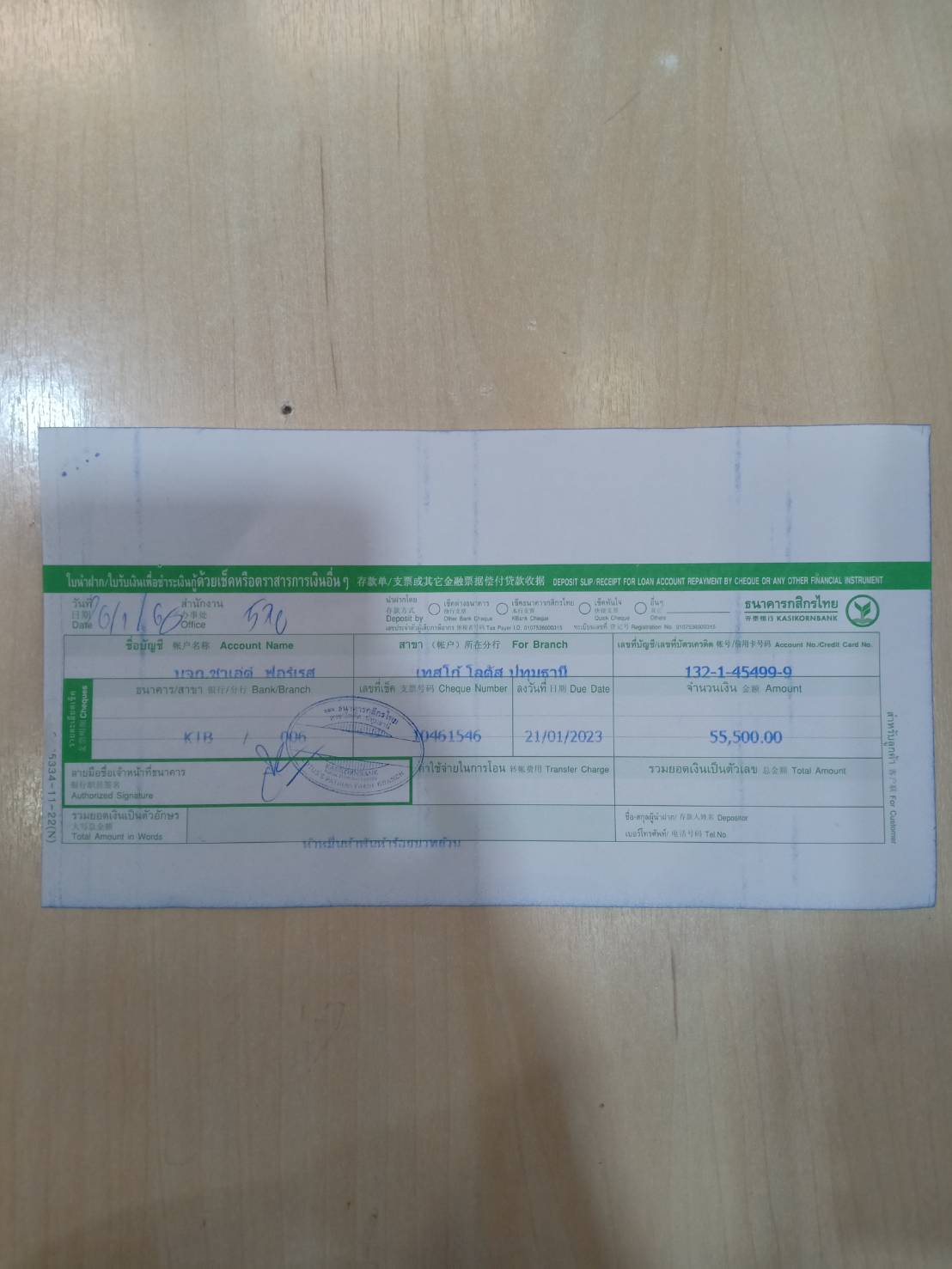 ฝากเช็ค รวมช่าง ลงวันที่ 21-01-23