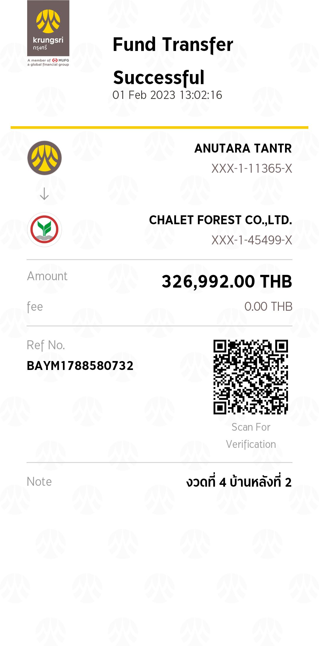 รับเงินโอน บ้านอนุตร หลังที่ 2 งวดที่ 4 ตัดชำระ INVPD2212-0152